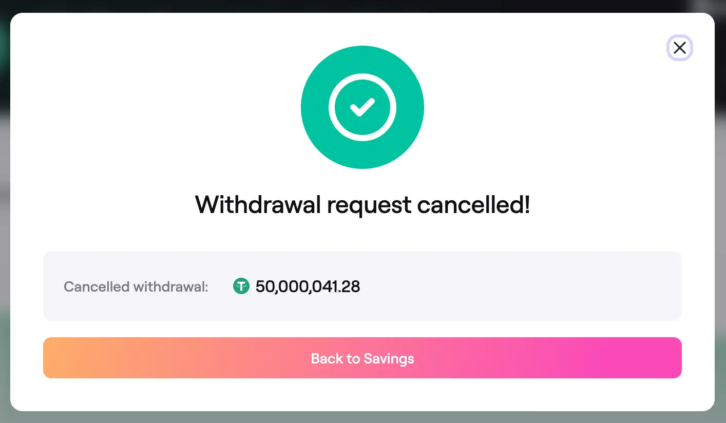 - After the transaction is confirmed, the app will show a success screen confirming that the withdrawal request has been cancelled.