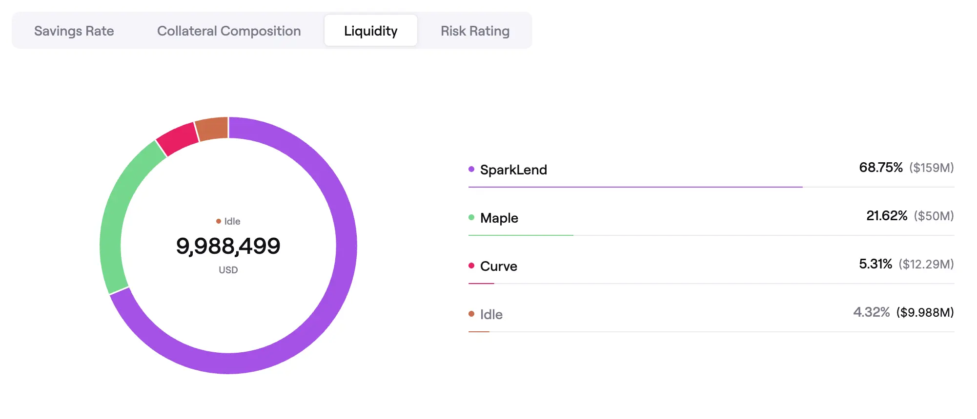 - Open the Liquidity tab to see how vault liquidity is allocated. The amount labeled Idle is the liquidity currently available for instant withdrawals.