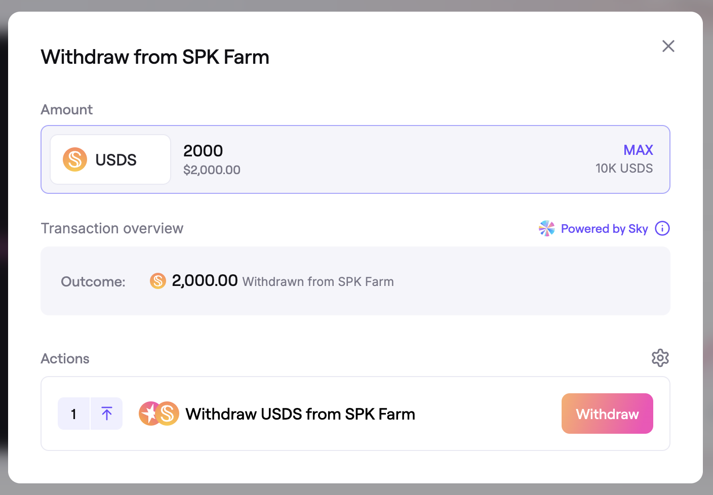 - Finalize your withdrawal by completing the transactions outlined in the Actions panel.