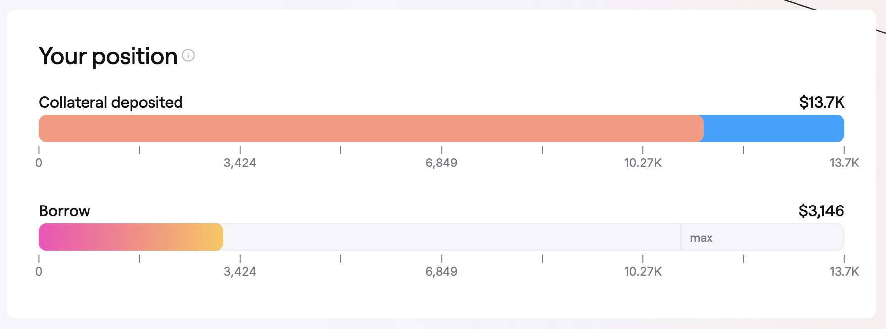 Your Position: Shows collateral value, loan value, and the max borrow amount