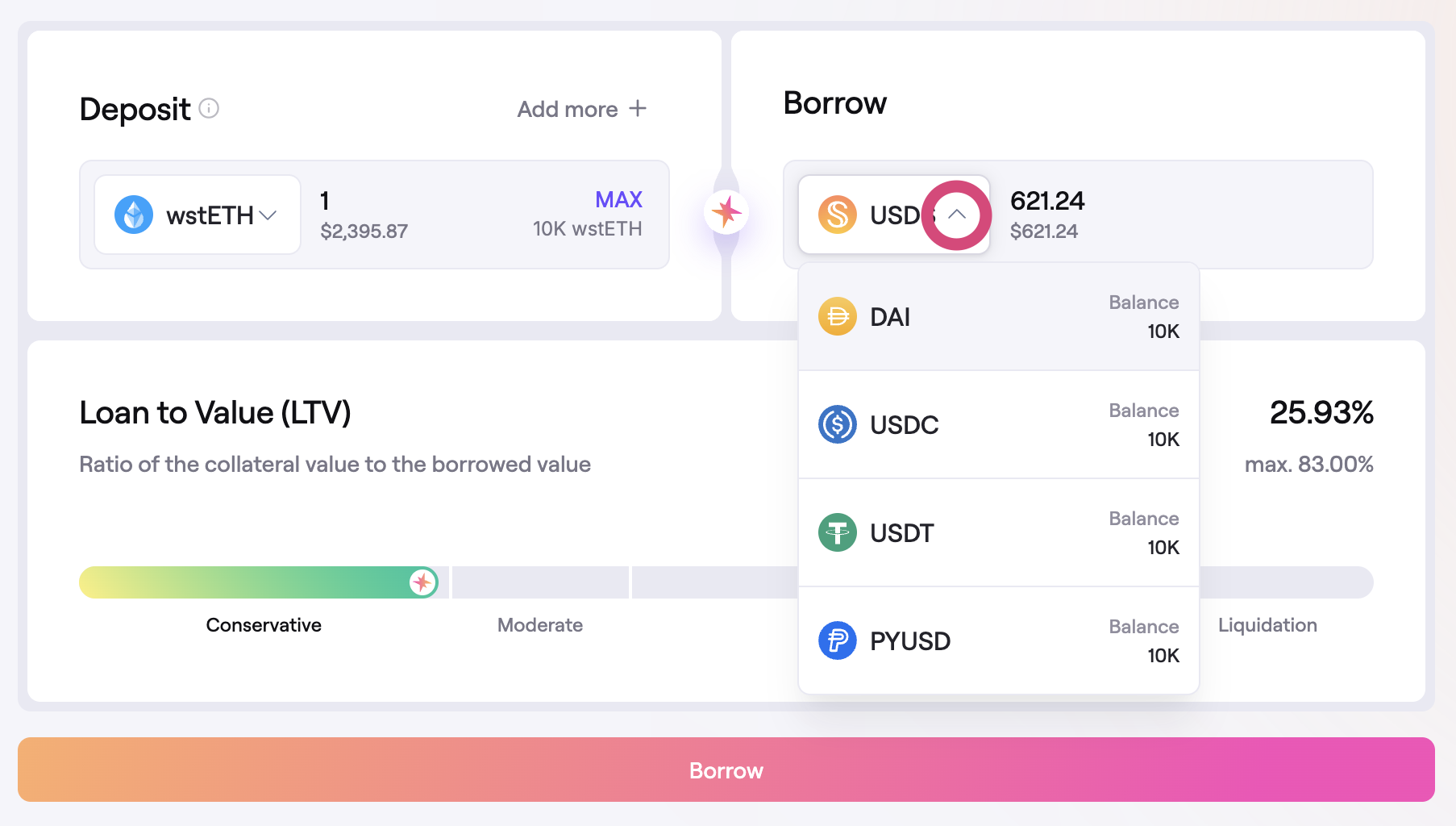 - Liquidation Indicator: The LTV slider also shows the LTV at which the position can be liquidated. The different collateral assets have a different liquidation LTV. Creating a position with multiple collateral assets will use an aggregate liquidation LTV based on the amount of each collateral.
