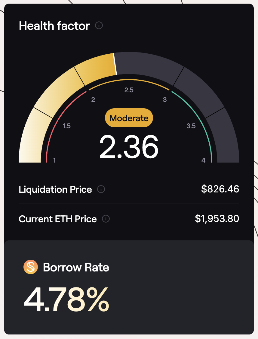 - Below you are able to see the simulated state of the borrow position based on the current price of the collateral assets and the borrow amount. It displays: