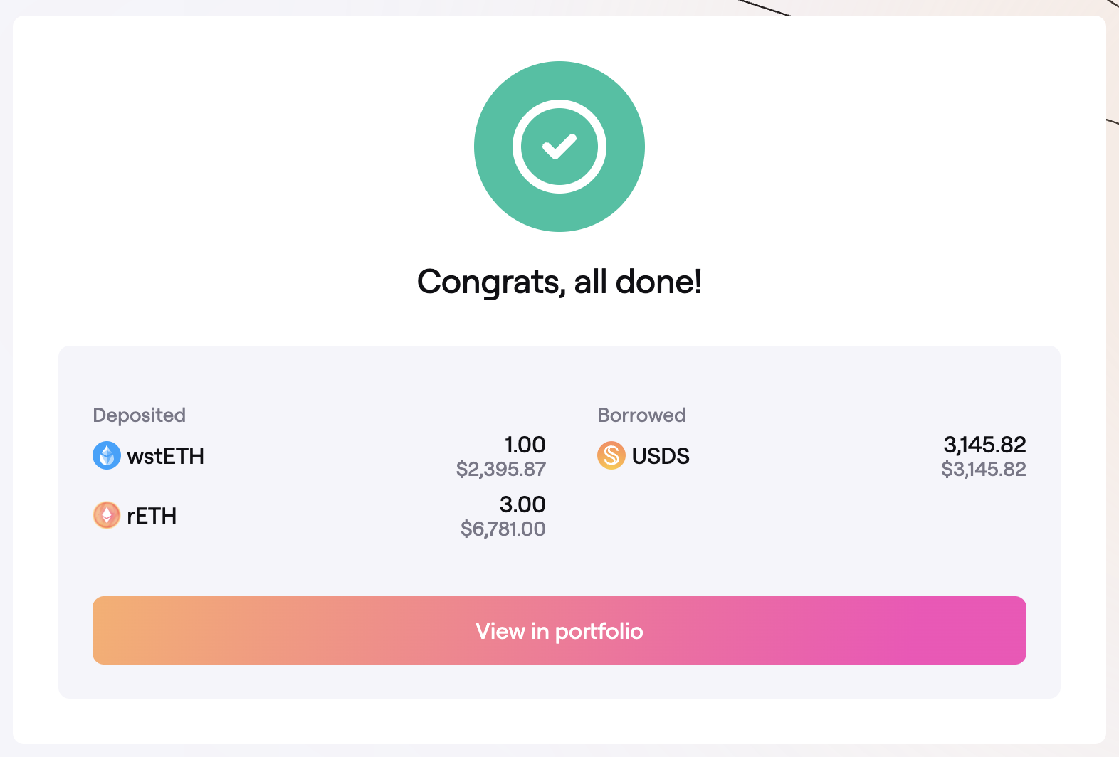 - Once every step is done, you will have received the borrowed Dai in your wallet, and a confirmation and overview of the actions. You can click on View in dashboard to view your new position.