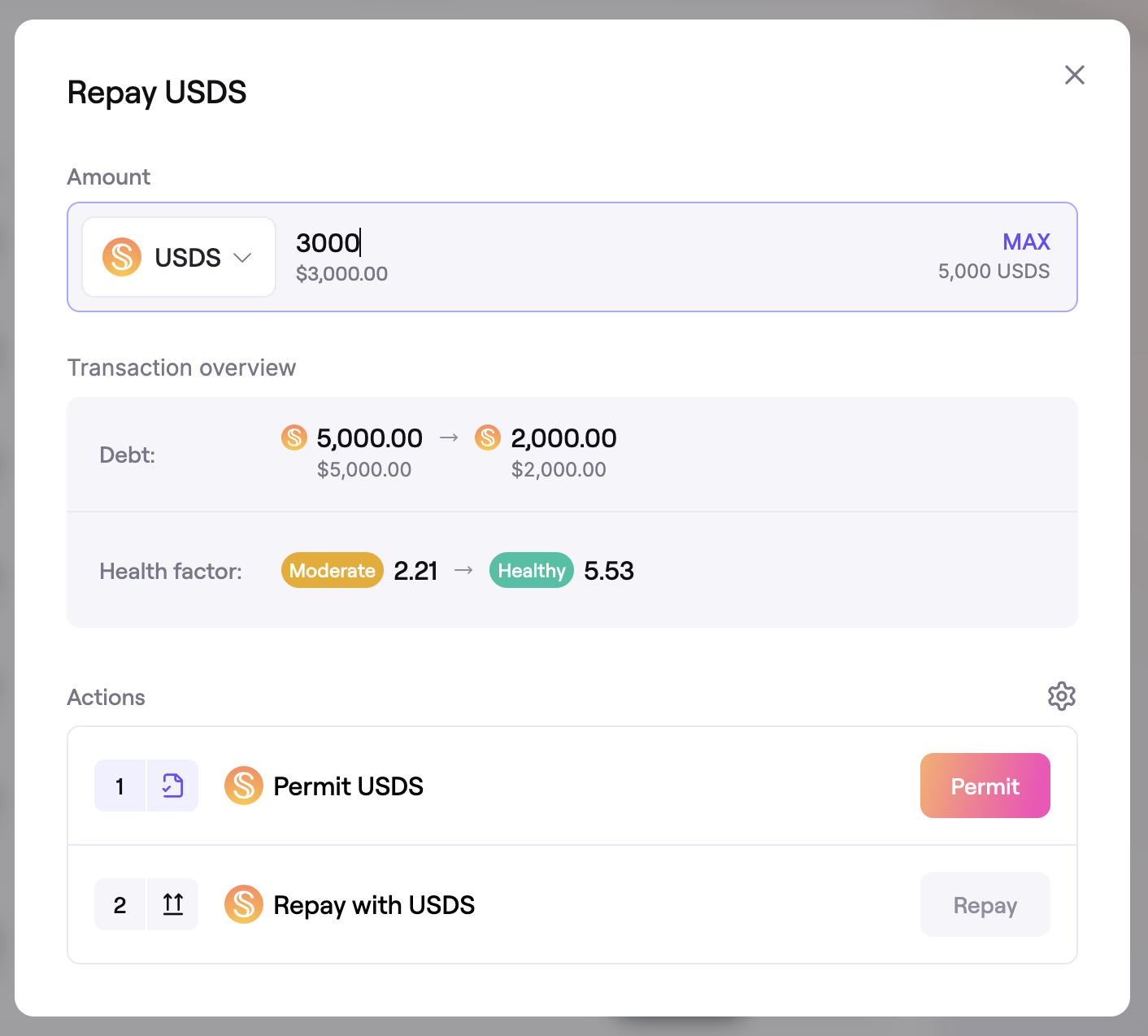 Based on the specified amount, the transaction overview will display the remaining debt, and the health factor of the position.